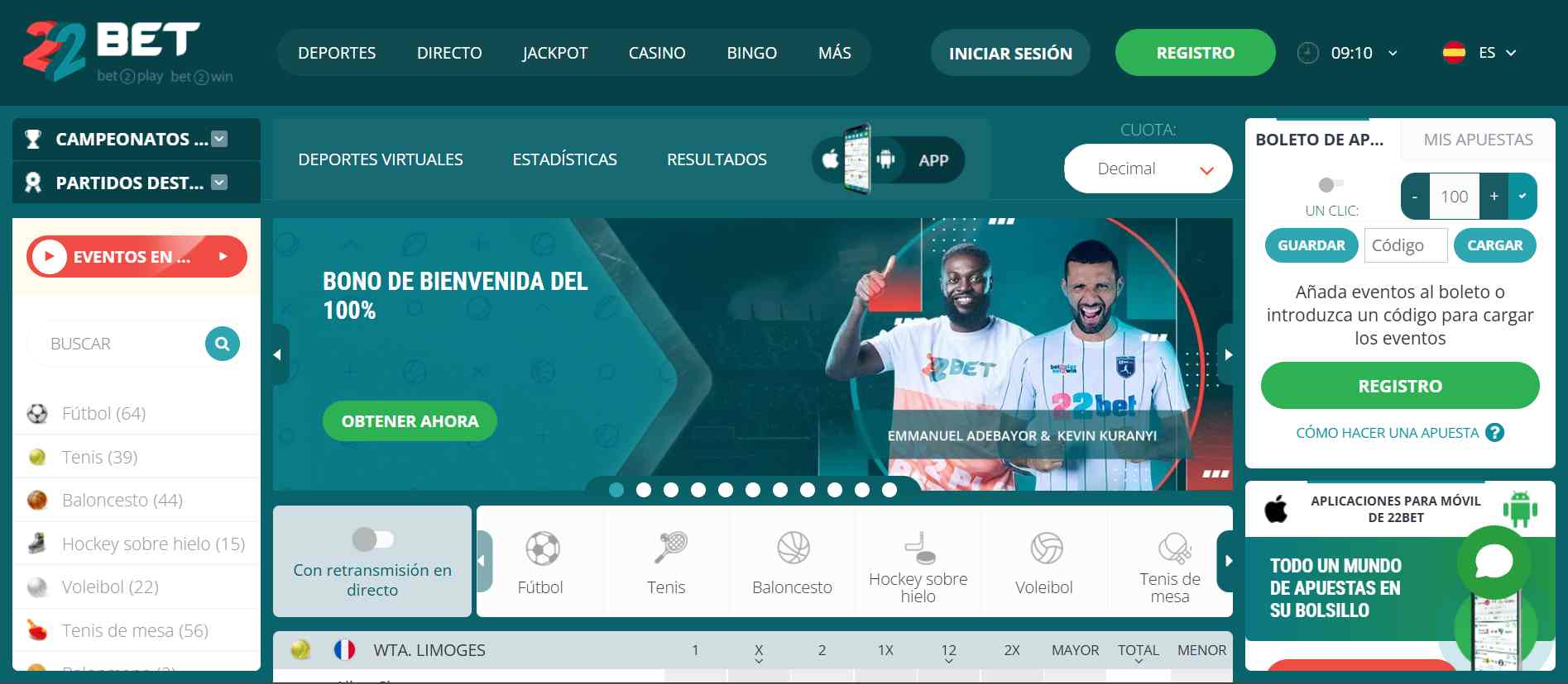 La oferta de eventos deportivos nacionales e internacionales puede variar dependiendo de la temporada, así que no está de más estar al tanto de lo que 22Bet Venezuela le tiene reservado. Estas ofertas van desde eventos en fútbol, siendo la disciplina más popular del sitio, hasta innovadores como los eSports y deportes virtuales, juegos que tienen su propia sección para disfrutar de animaciones de calidad y dinamismo de apuestas.