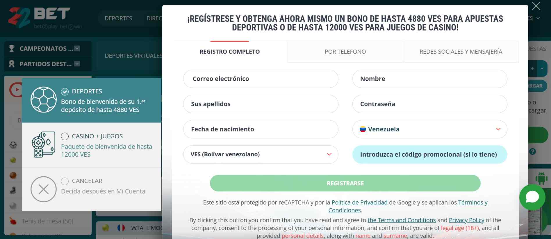 Este bono de bienvenida 22Bet consiste en realizar un primer depósito de, al menos, 40 VES, el cual se duplicará al 100% hasta 4880 VES, siendo el bono de apuestas máximo. Para la activación y reclamo de fondos reales, el usuario debe seguir una serie de términos y condiciones como: