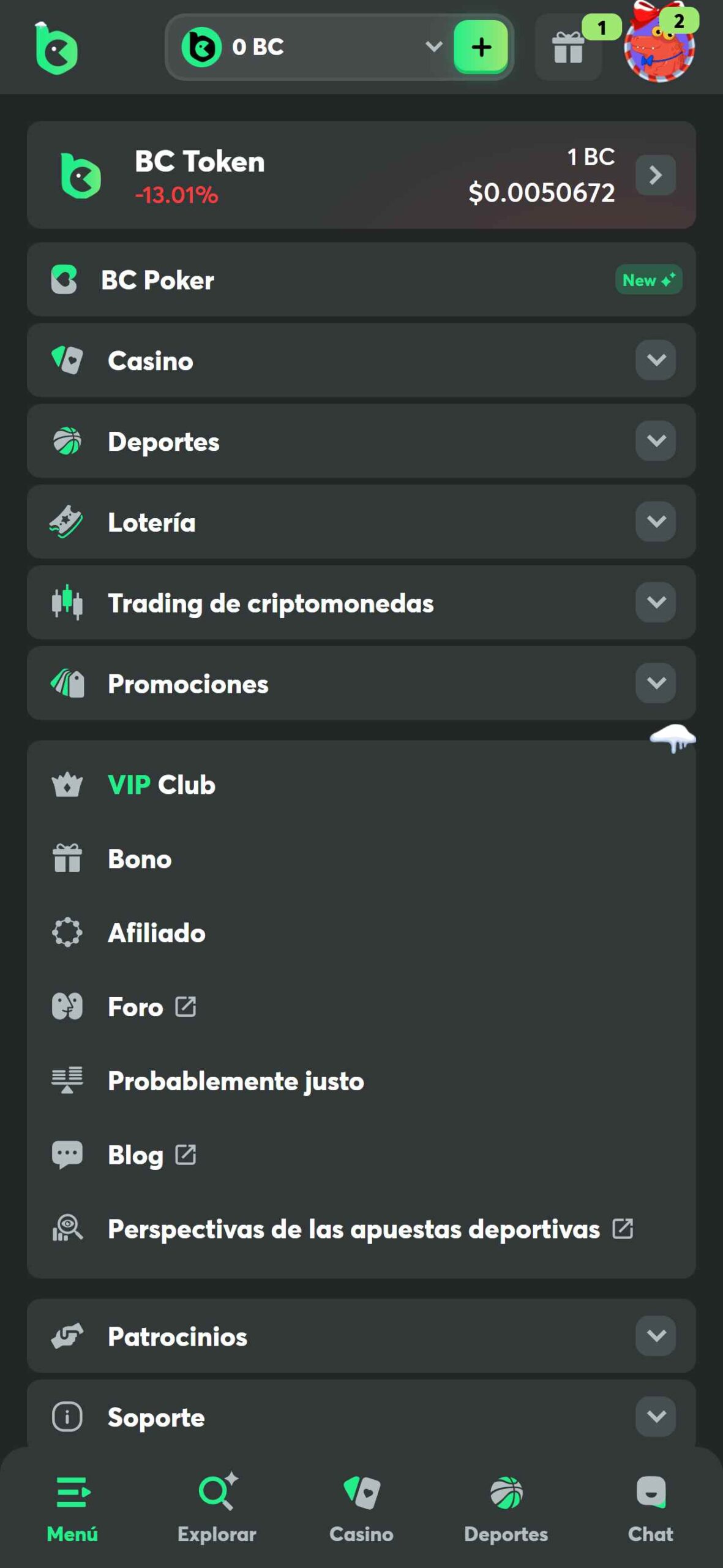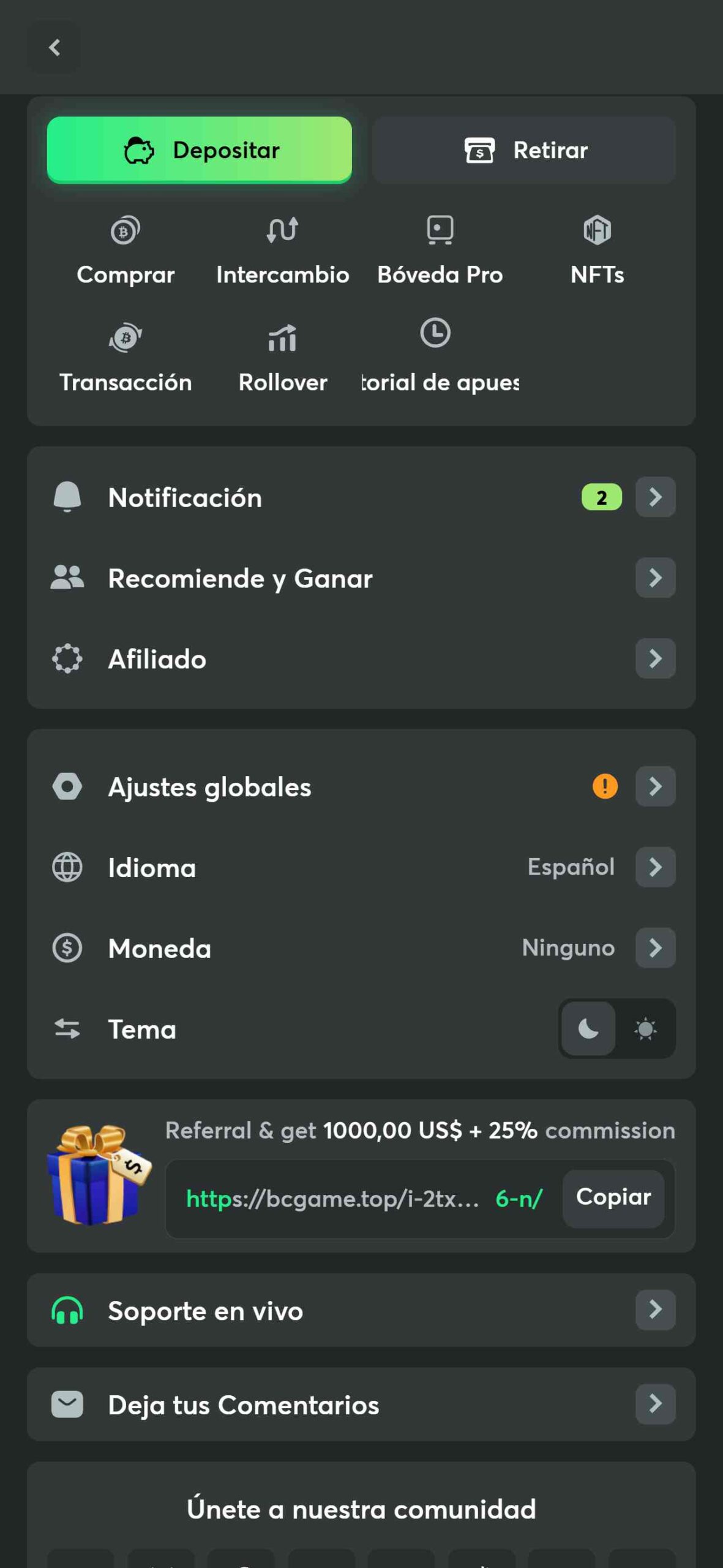 Una de las funciones o características destacables de bc game es el uso de un único menú, donde más allá de encontrarse las ya mencionadas pestañas, también cuenta con información relevante del sitio, como los patrocinios, así como también las configuraciones en cuanto a idioma y aspecto en cuestiones de color, indicando dos modos; claro y oscuro.