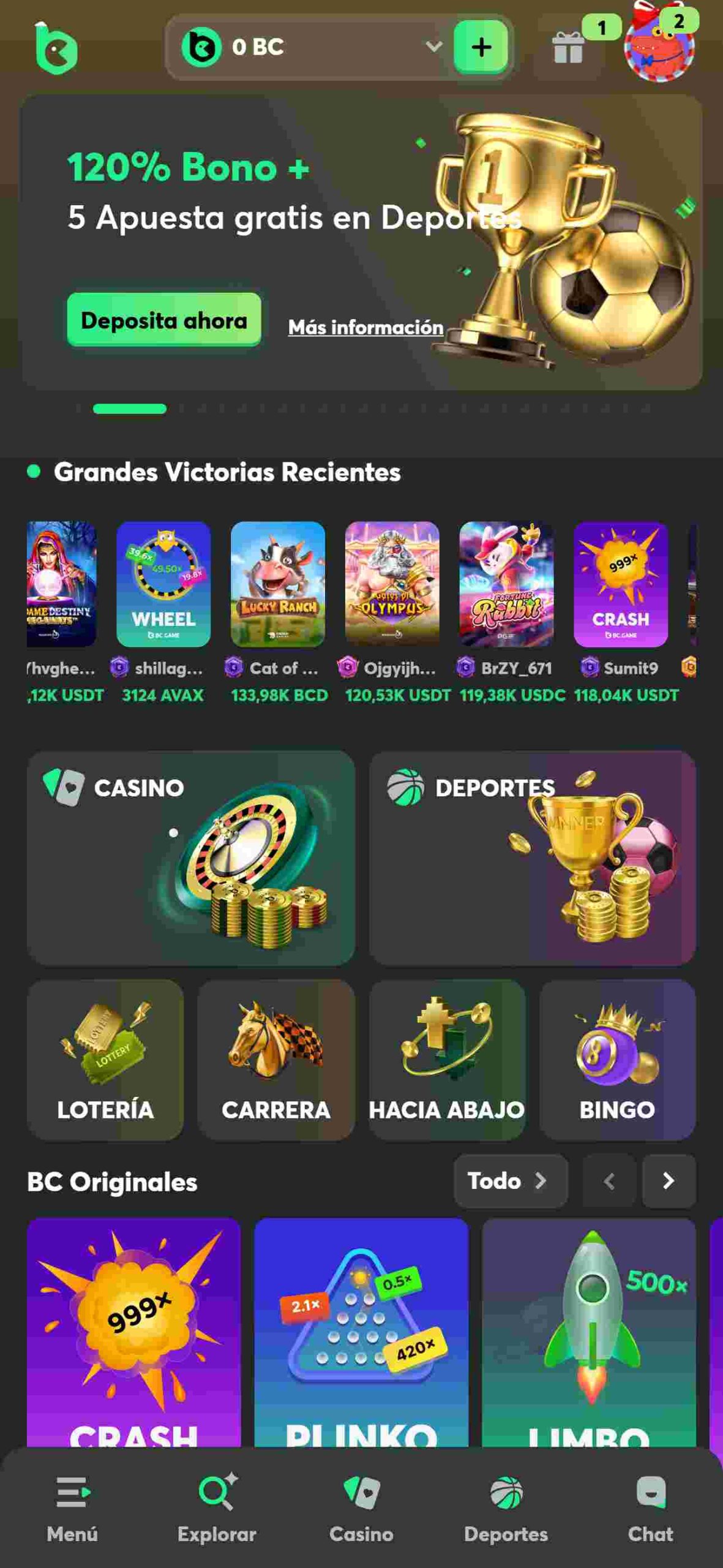En la zona superior de bc game, también podrá hallar barra de búsqueda con filtros, su perfil, promociones, saldo disponible en el sitio y un chat donde podrá interactuar con otros usuarios donde podrá hacer preguntas o compartir sus últimos logros.