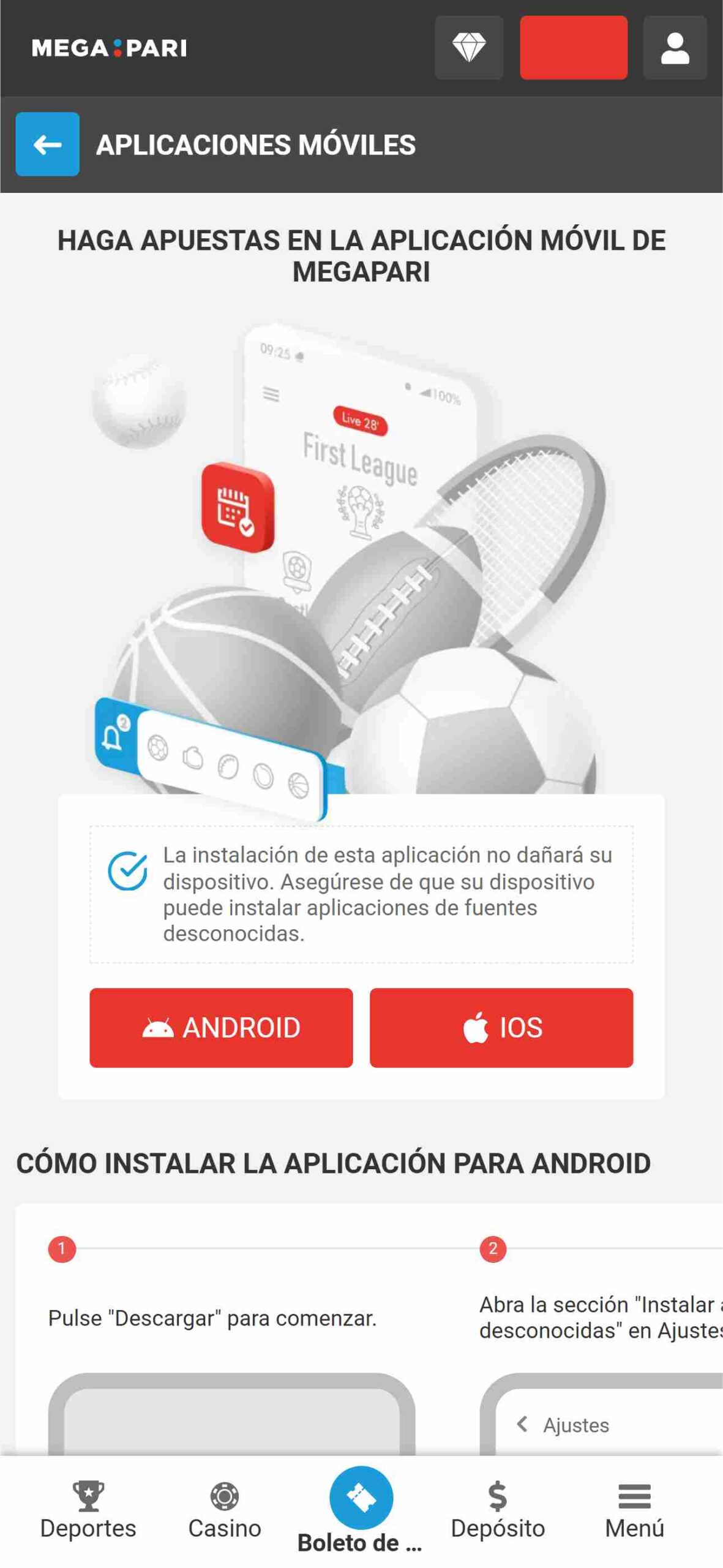Una gran ventaja de apostar con Megapari es que puedes hacerlo desde tu celular con la aplicación, disponible para sistemas operativos Android y iOS. La descarga es totalmente gratuita y rápida. ¿Dónde puedes descargarla? A través de la página web, sigue estos pasos: